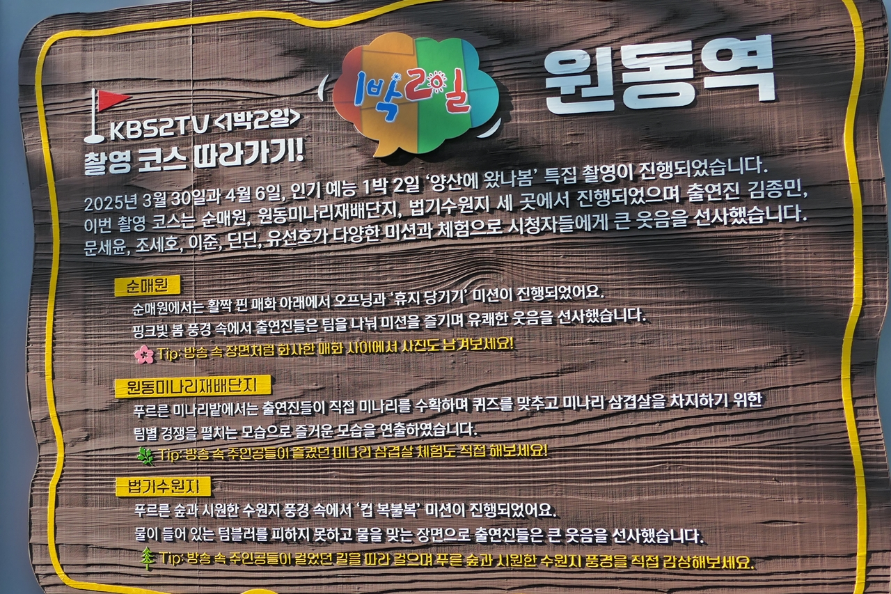 2026. 03. 04, 7산회원 8명이 한창 만개한 원동 순매원 매화 탐방을 하면서 하루를 즐겼다. 낙동강변에 자리한 경부선 원동역과 역 앞의 주변 관광지 소개 간판.경부선 옆에 위치한 순매원 순매원 매화가 만개를 시작하다. 매화는한겨울 추위를 이겨내고 가장 먼저 피어나는 봄의 전령사로, 꽃말은 고결한 마음, 기품, 결백, 인내를 상징한다.모시 옷을 곱게 입은 청순한 시골 아낙같은 흰색의 매화 한그루에 백매화와 홍매화가 같이 핀 매화홍매화가 활짝 핀 순매원 입구열정 이란 꽃말을 가진 홍매화의 색깔이 고혹적이다.경부선 원동역을 지나는 상행선 열차인물사진