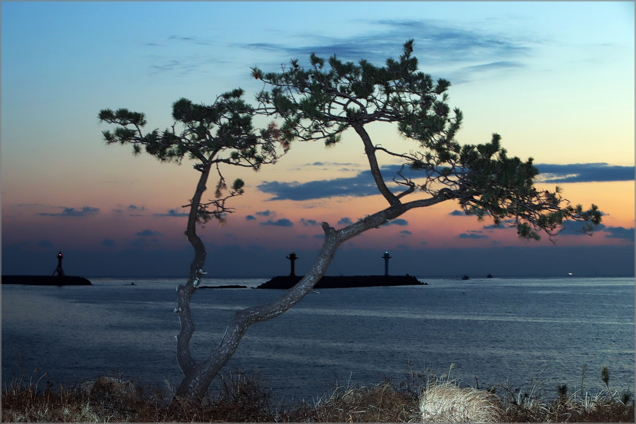 연하리 소나무와 멀리 불 켜진 대변항 입출항로표지등대