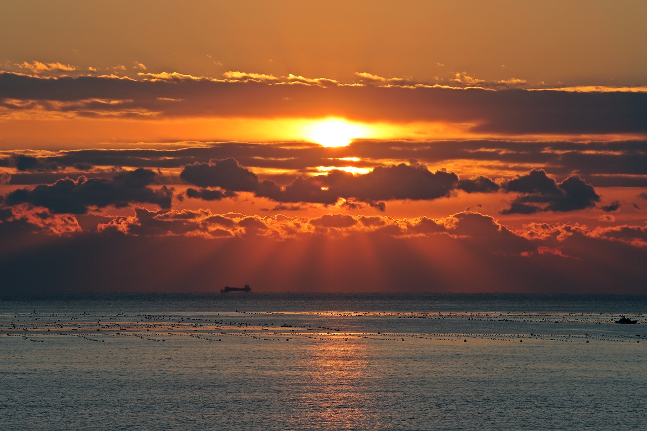 동쪽 수평선의 짙은 해운 위에서 일출이 시작되다.