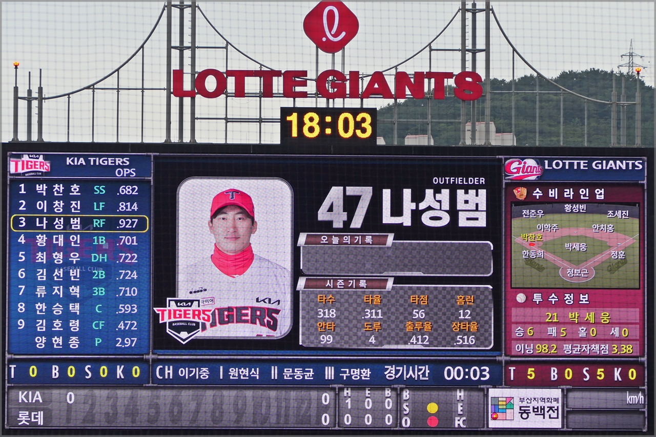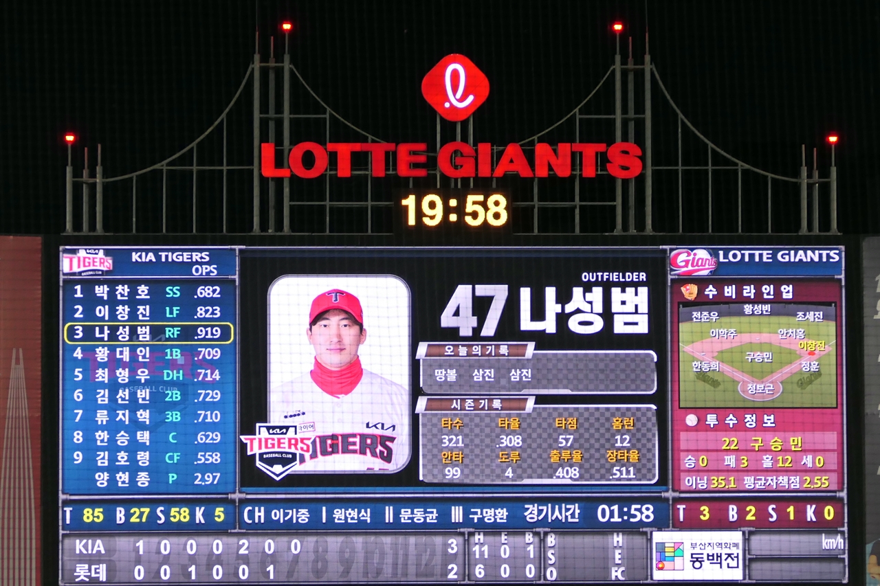 타이거스의 간판타자 나성범과 롯데의 간판 이대호 선수의 공격모습