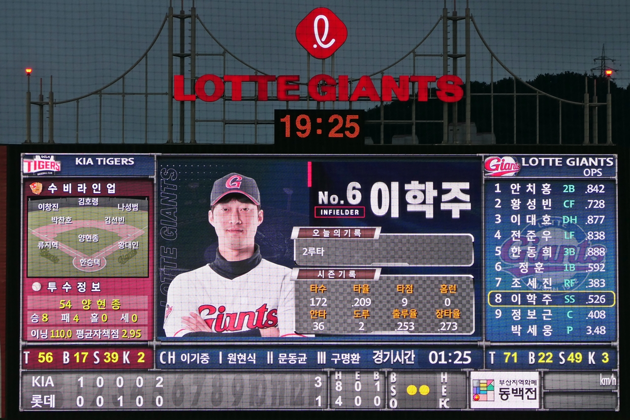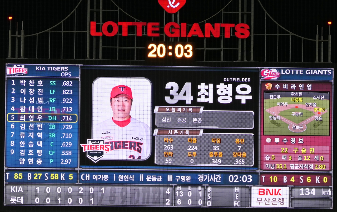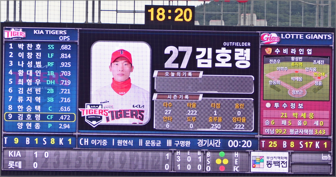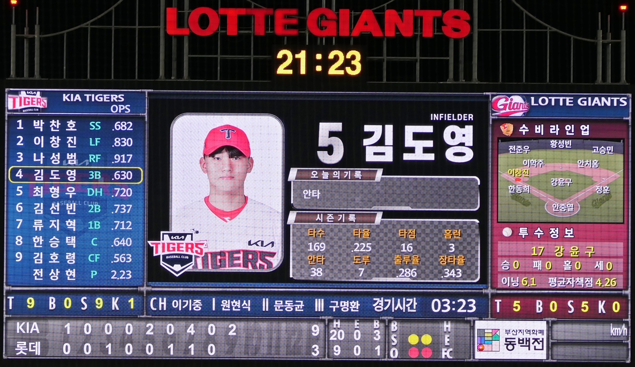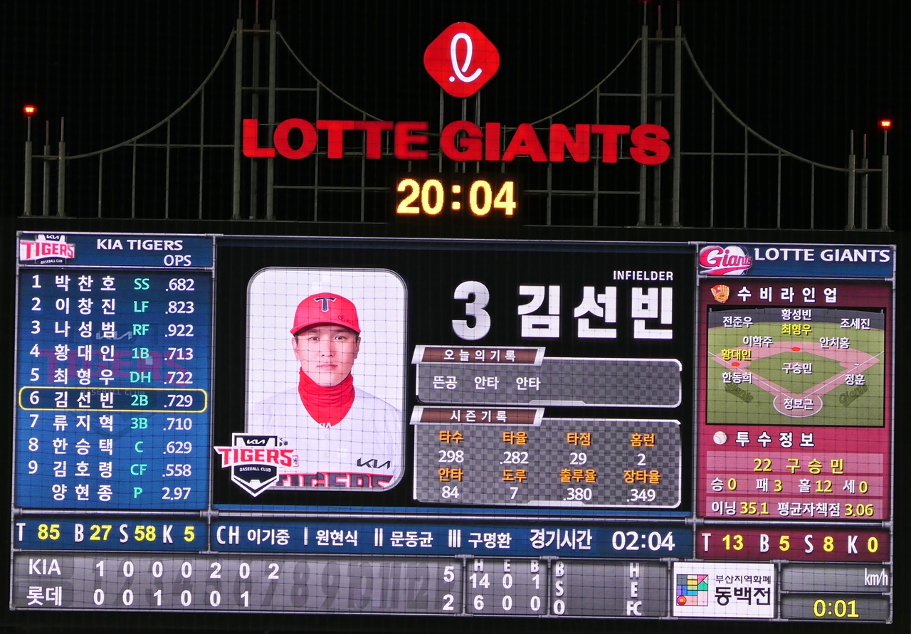 20안타 9득점을 얻은 기아가 10안타 3득점을 한 롯데에게 2연승을 거두고 5위를 굳건히 지켰다.