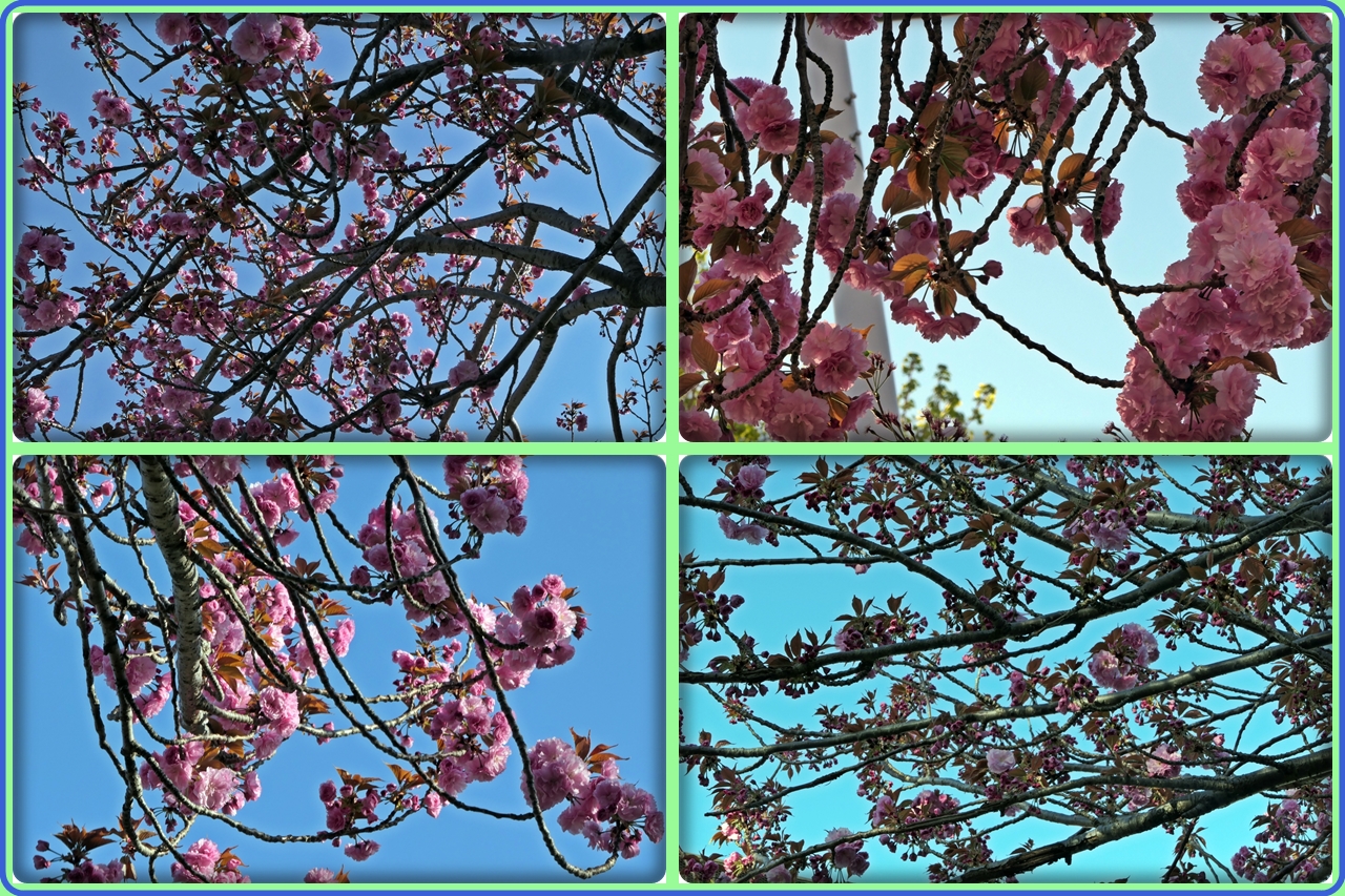 진홍색 박테기나무 꽃은 피기 시작하는데 벚꽃은 많이 떨어졌다.