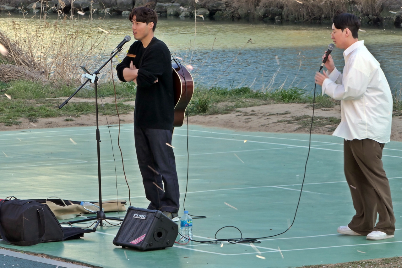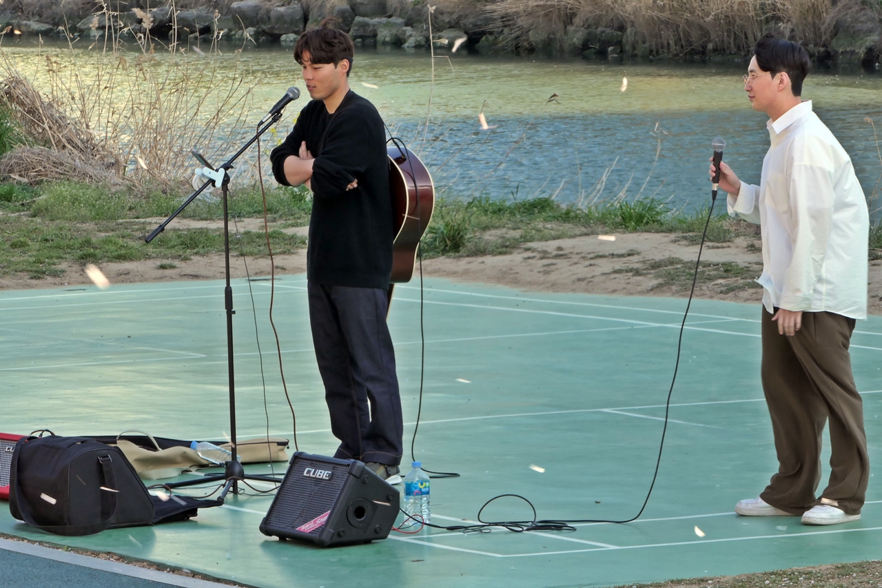 즉석 음악회를 열어 노래를 선물하는 젊은이들.
