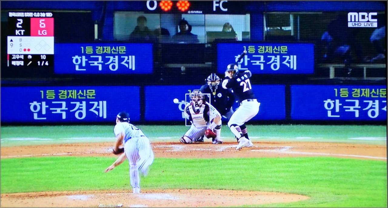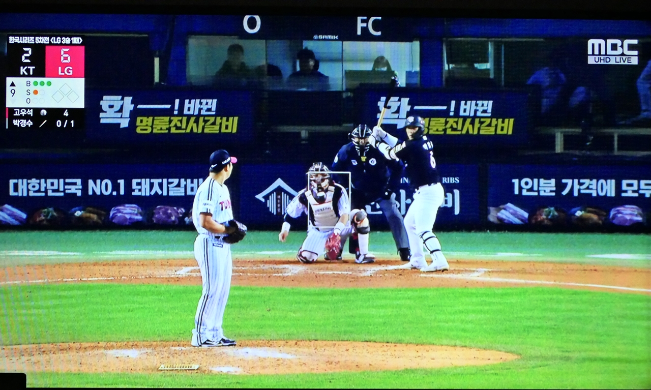 9회 초 LG 마무리 투수 고우석과 KT 타자 박경수와 조용호와의 대결