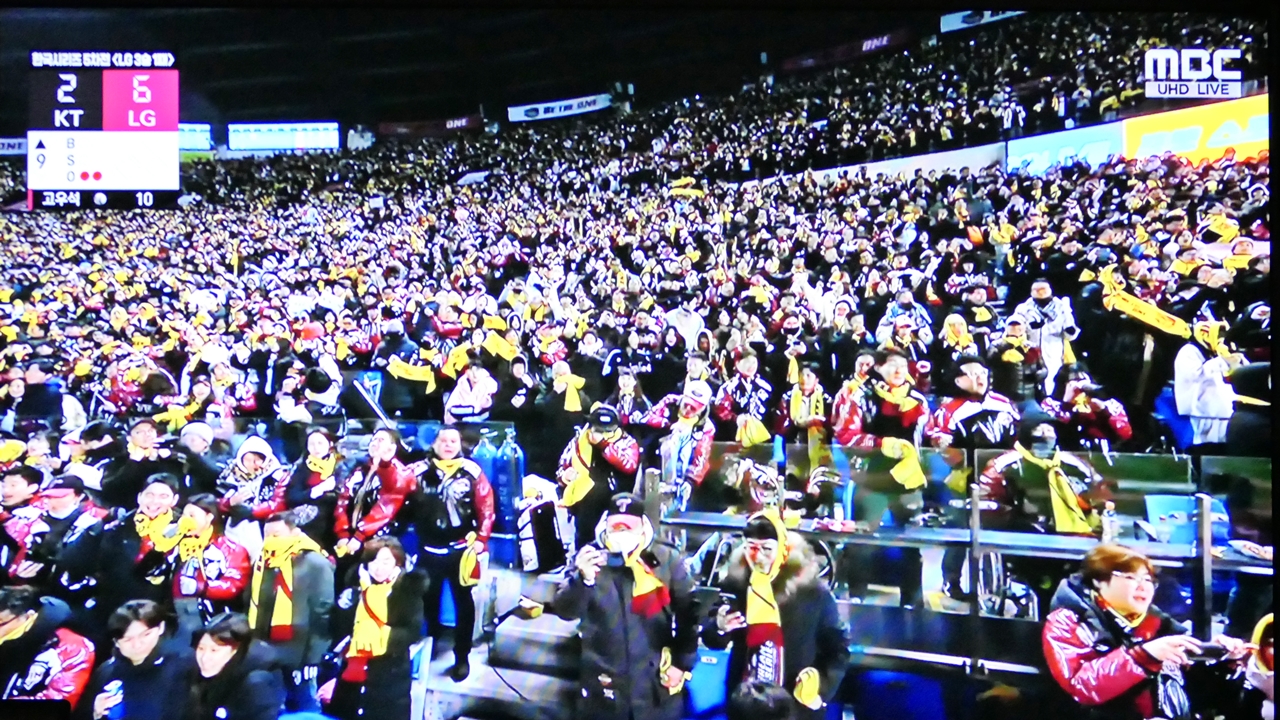 승리를 염원하는 LG 팬들과 KT의 마지막 타자 배정대와 대결에서 이긴 LG 마무리 투수 고우석
