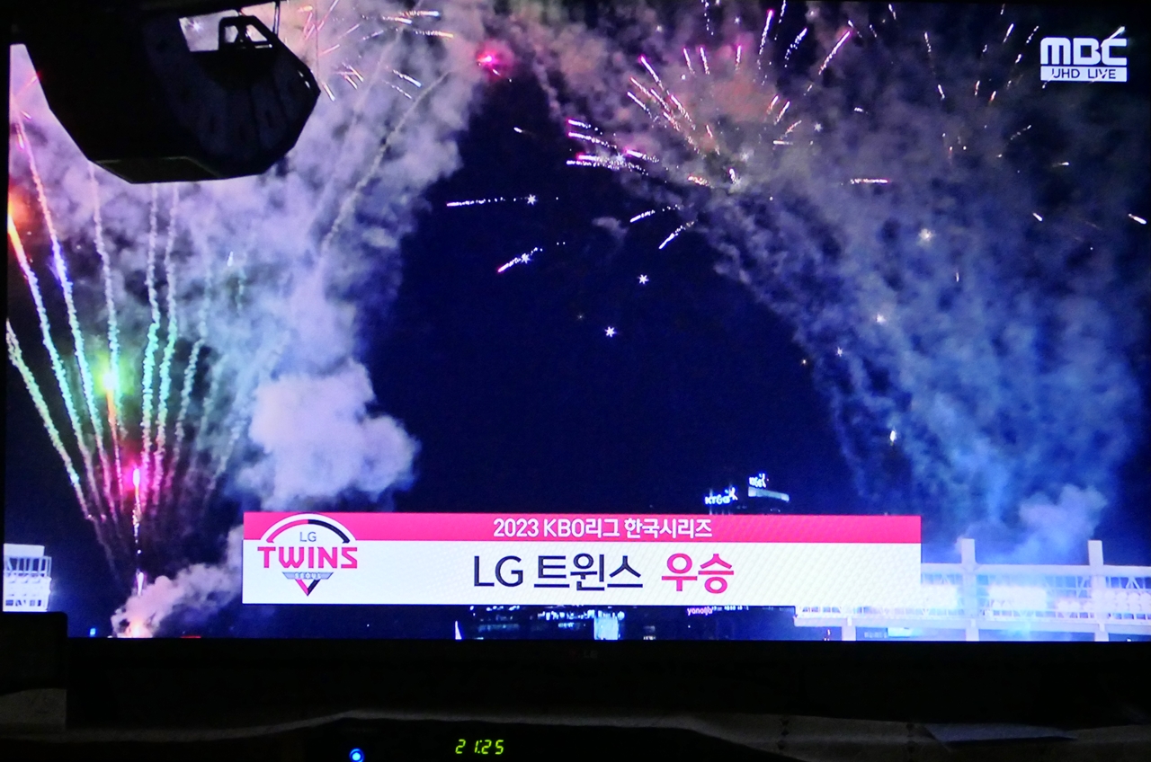 우승을 축하하는 불꽃과 환호하는 야구팬들