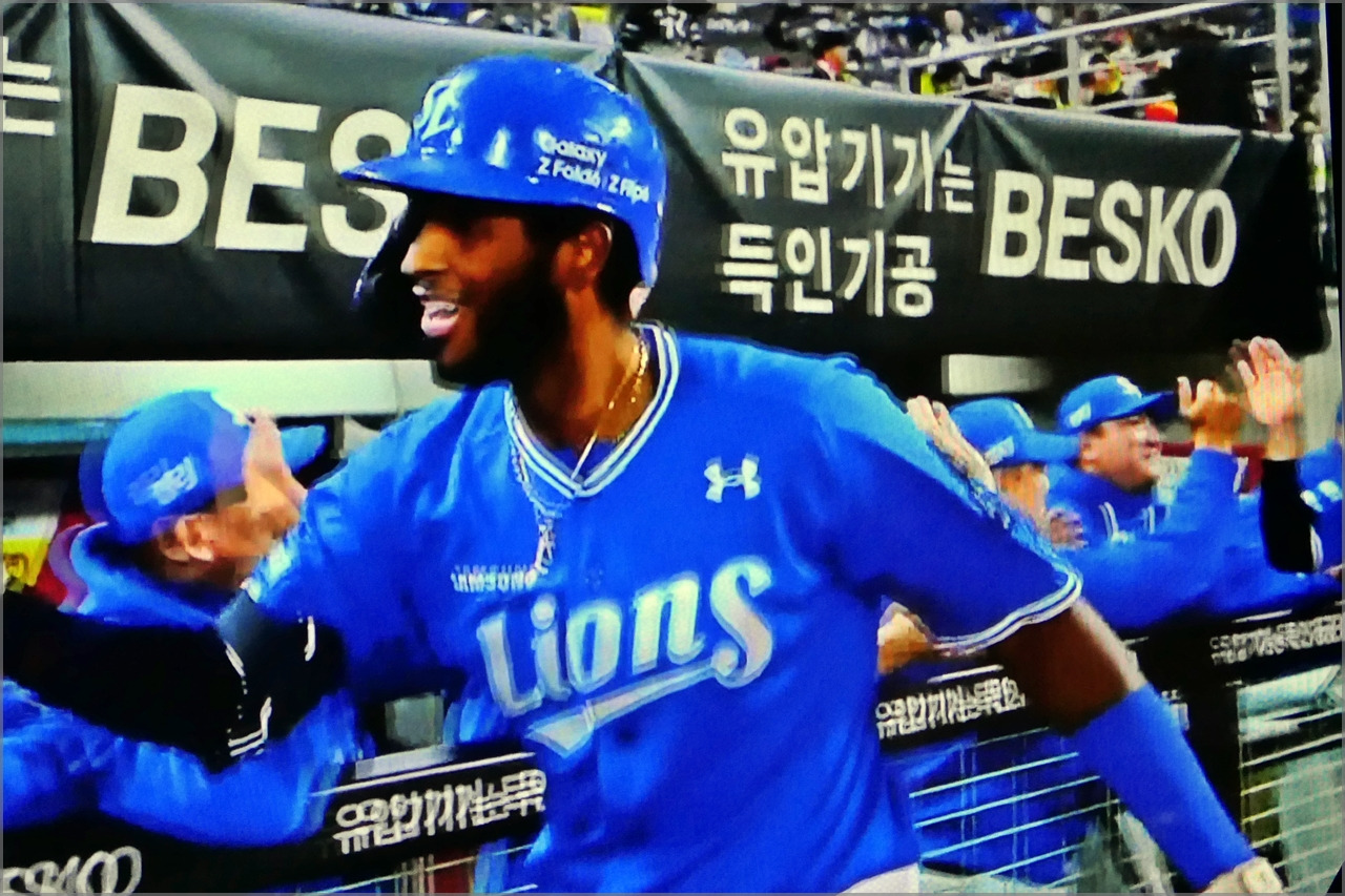 3회 초 연타석 2점 홈런을 쏘아 올린 디아즈가 환호하며 홈에 들어오다.
