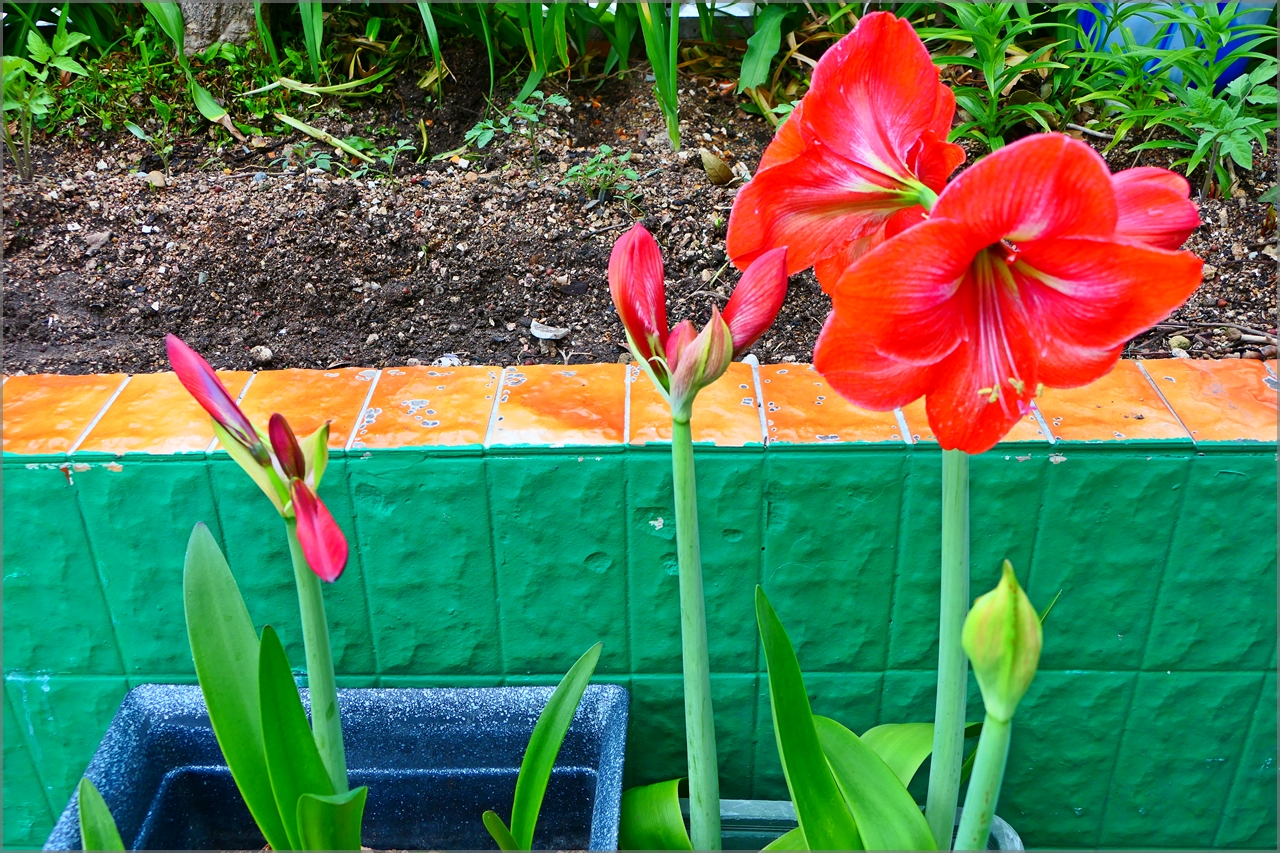 옥상화단에 피어있는 화려한 마마릴리스