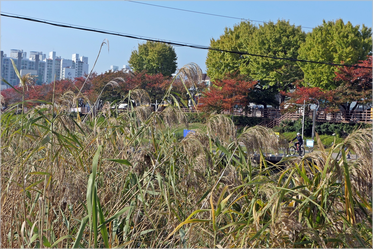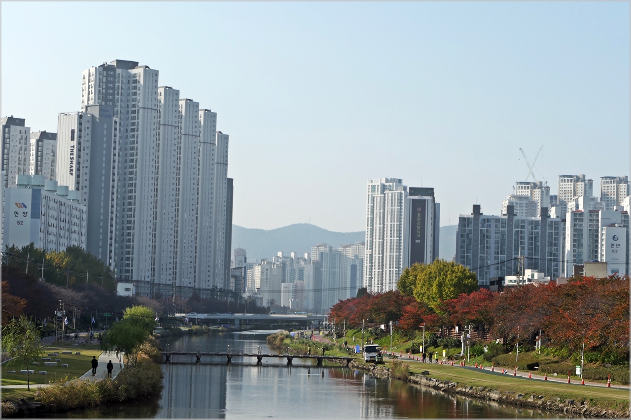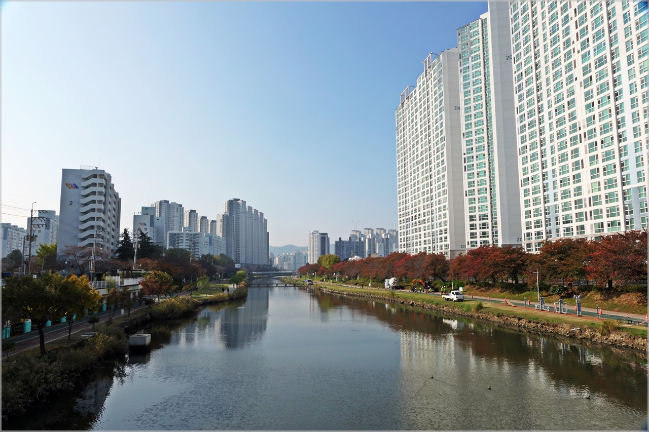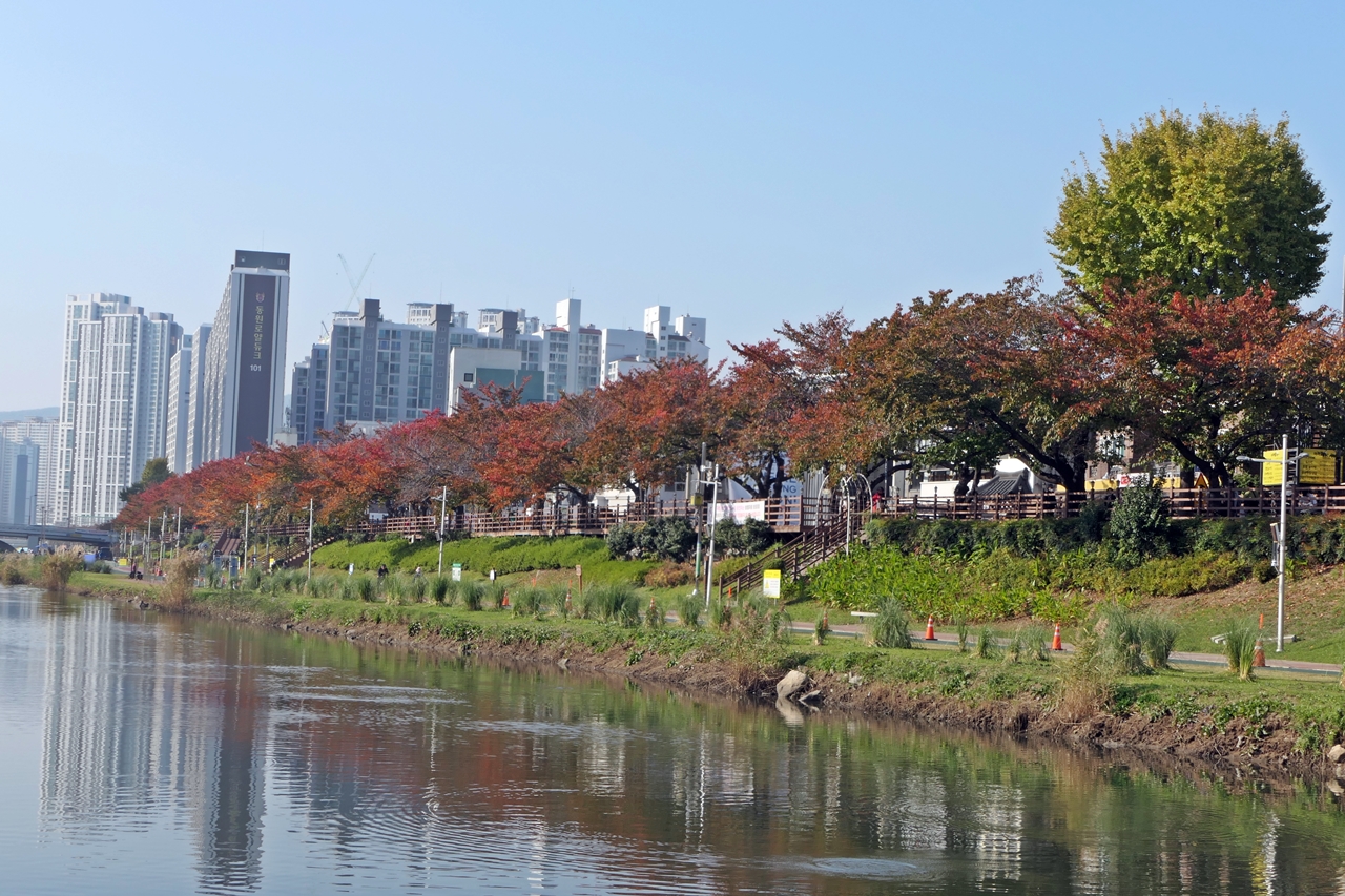 왼쪽 연산동 쪽의 벚잎은 다 떨어졌으나 안락동쪽은 벚나무는 단풍이 곱다.