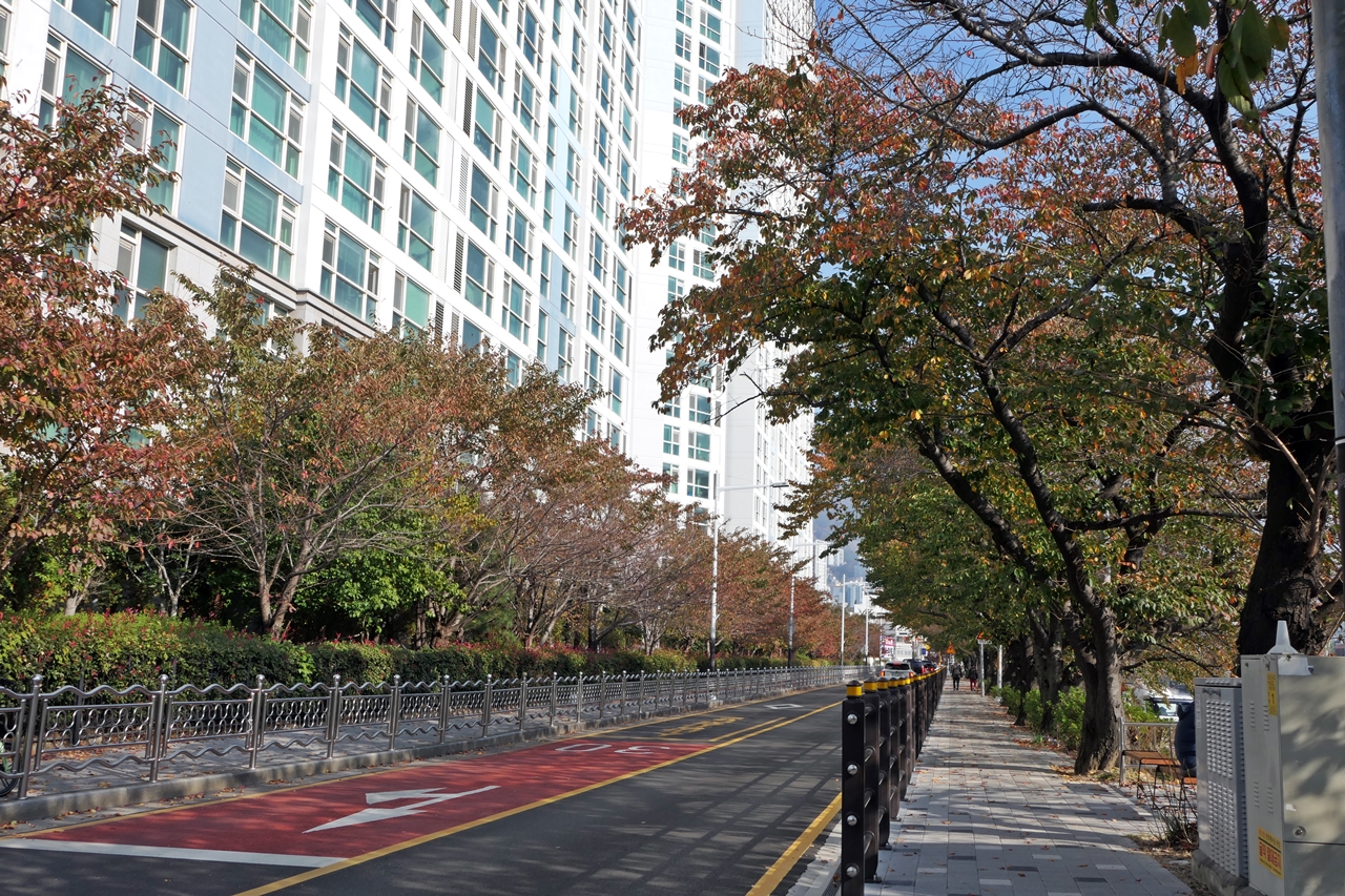경동 리인 아파트 앞 도로의 벚나무 단풍길.