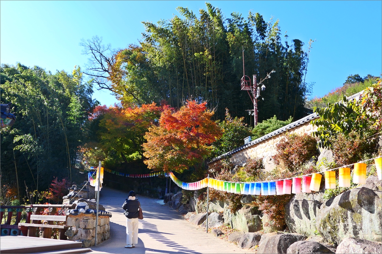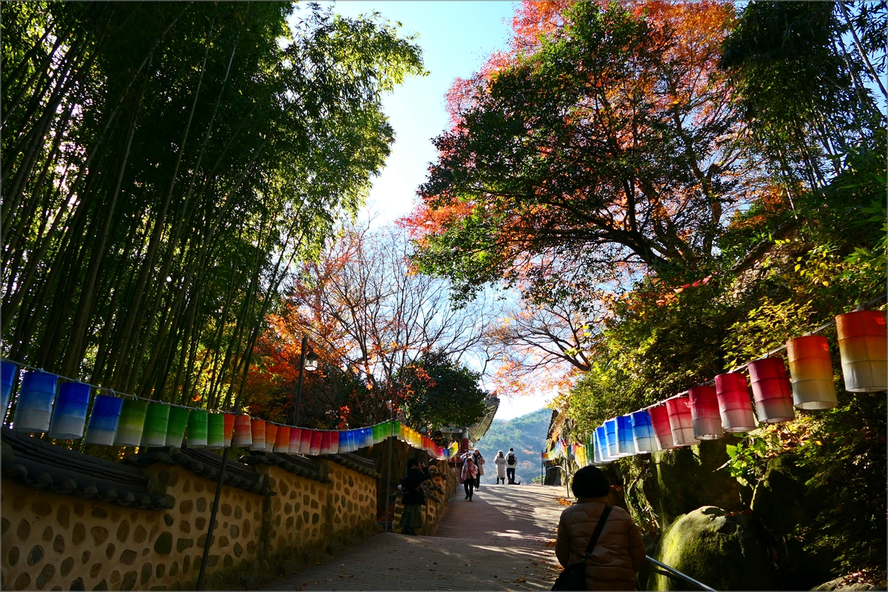 설법전에서 대웅전 가는 대숲과 단풍이 어우러진 비탈길