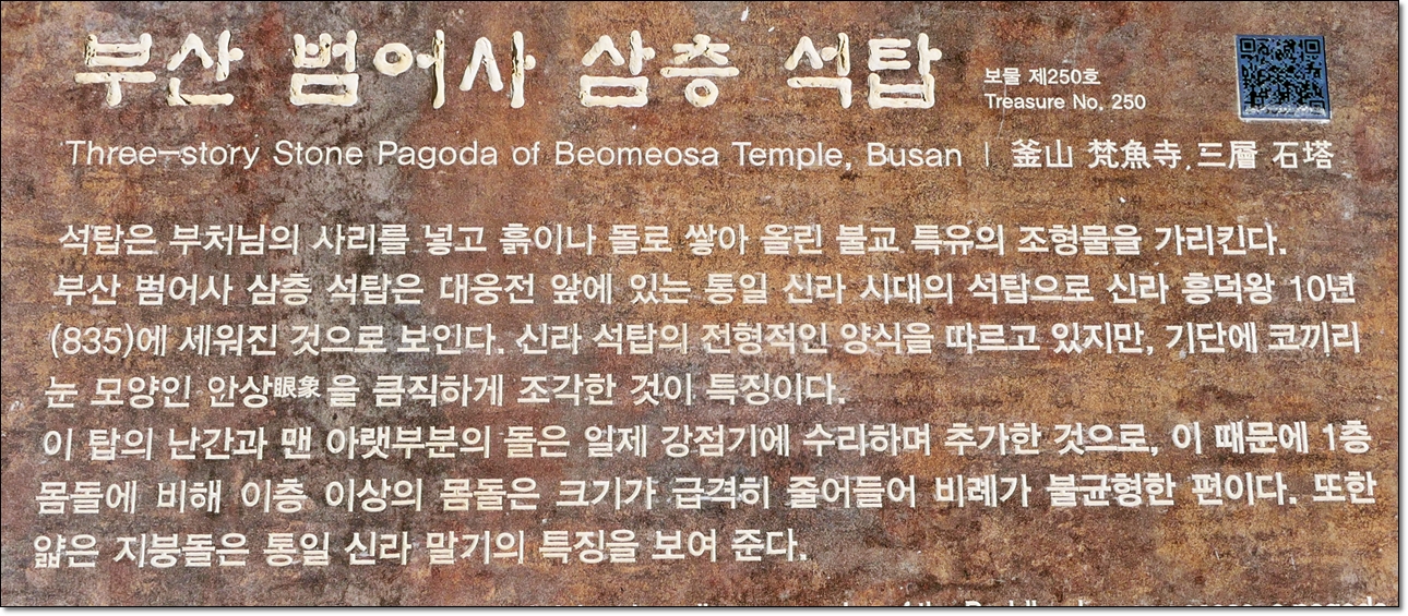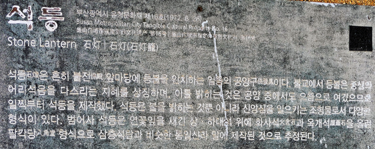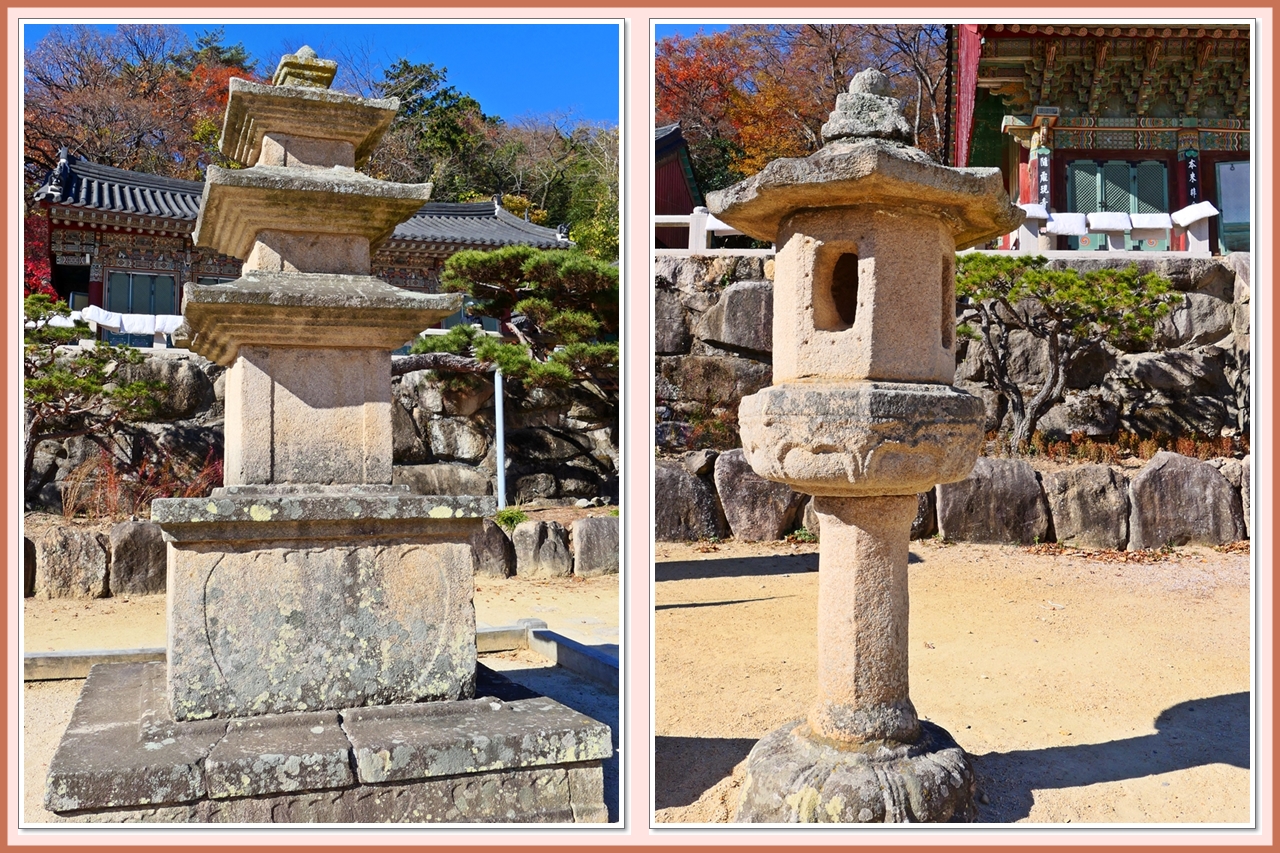 대웅전 아래 마당 양쪽에 있는 보물 삼층석탑과 부산시 문화재인 석등