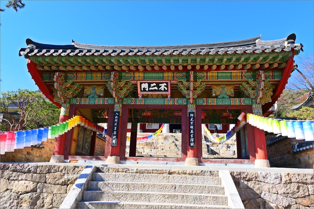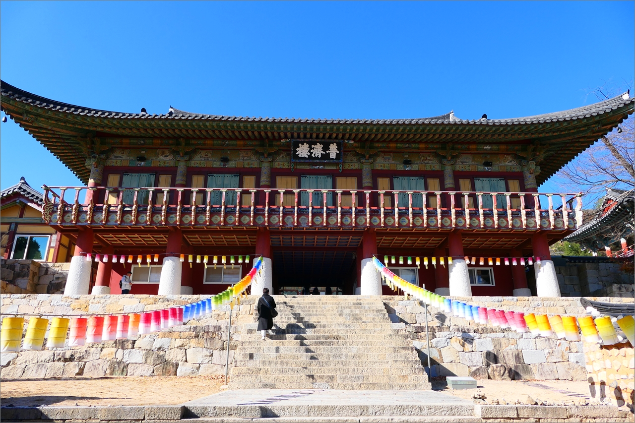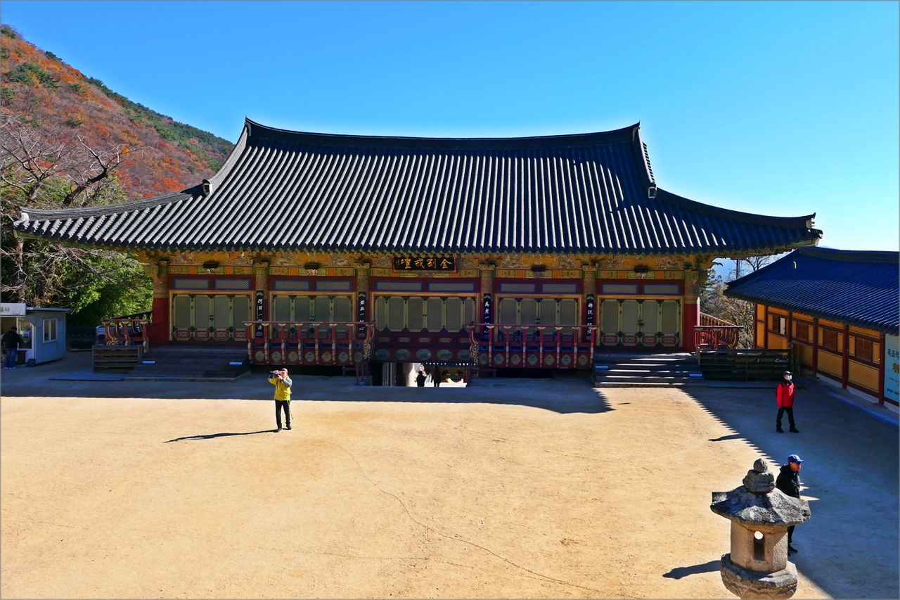 대웅전에서 보며 금강계단, 입구에서 보면 보제루인 가장 웅장한 건물