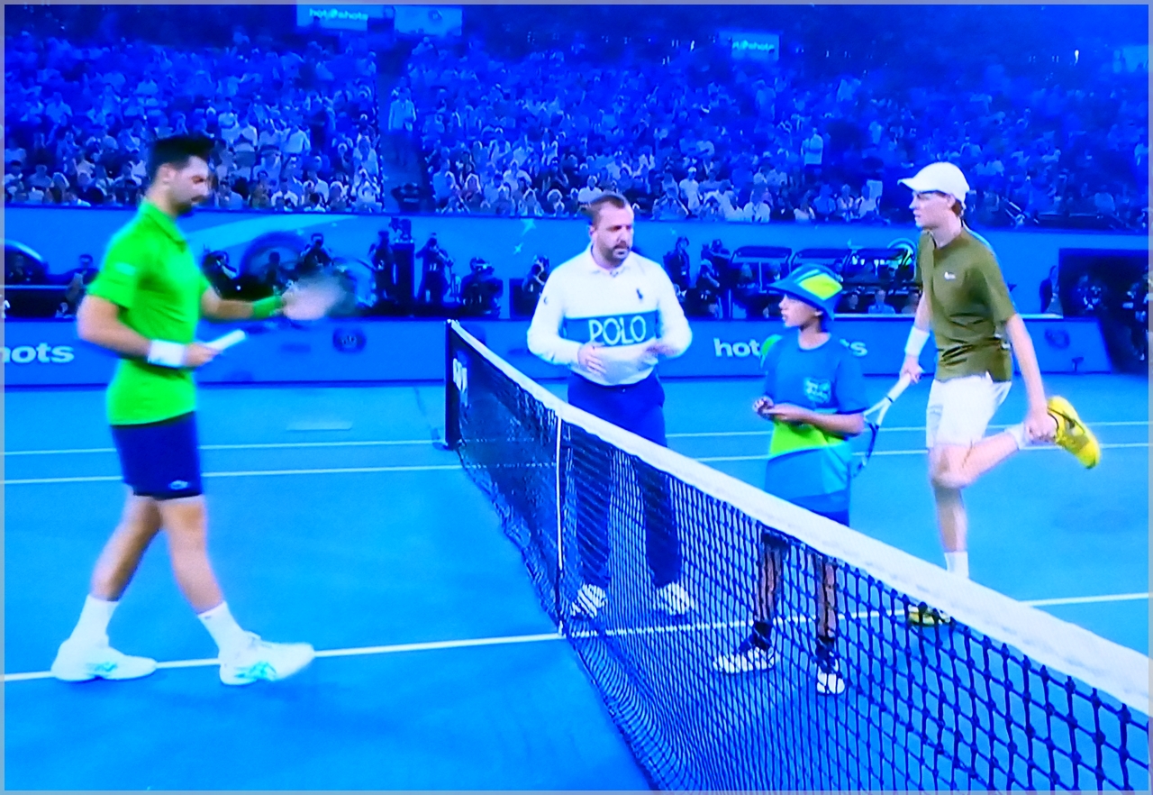 결승에 오른 조코비치와 시너의 경기 후 축하와 위로의 포웅