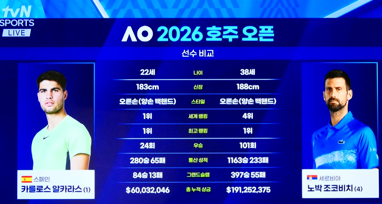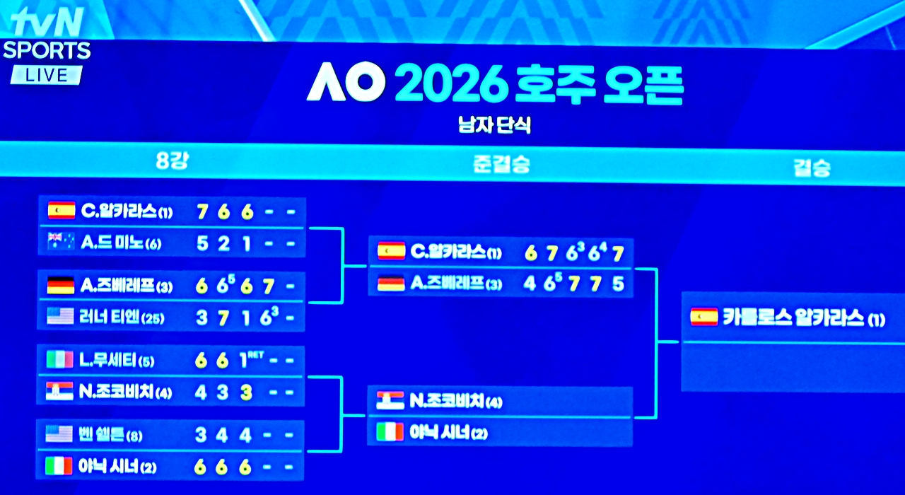 8강전에서 결승까지 대진표와 결승전 진출자인 알카라스와 조코비치선수의 정보