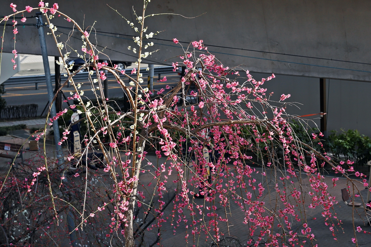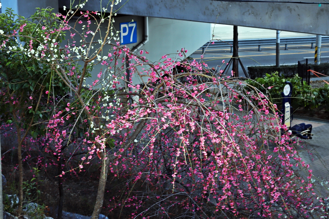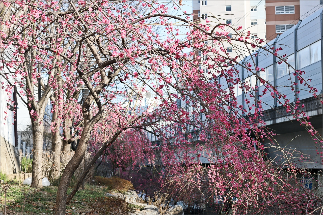 동해선 동래역과 안락교차로 사이 '기찻길 옆 유쾌한 동산 마을 ' 앞 언덕에 만개한 수양 홍매화