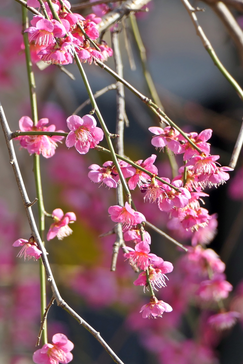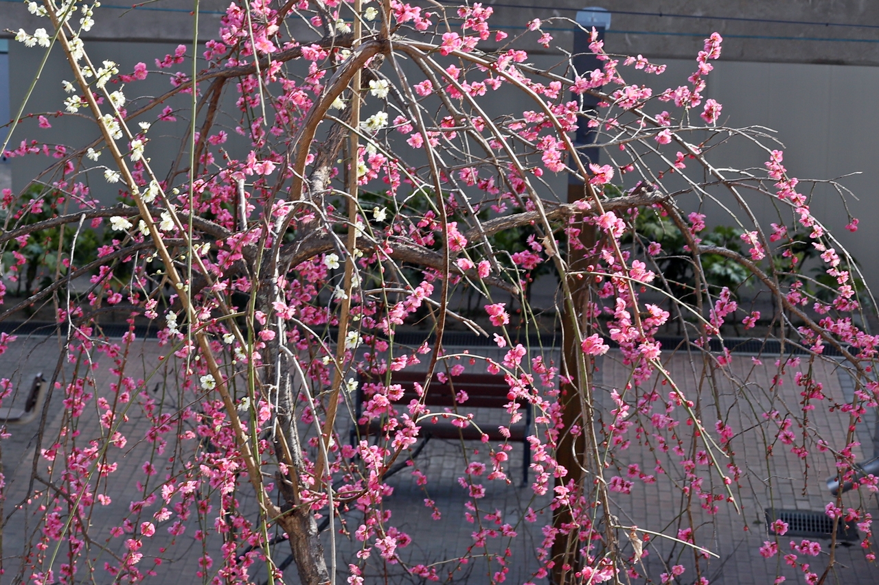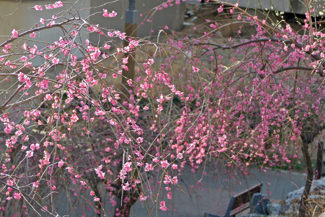 동해선 동래역과 안락교차로 사이 '기찻길 옆 유쾌한 동산 마을 ' 앞 언덕에 만개한 수양 홍매화