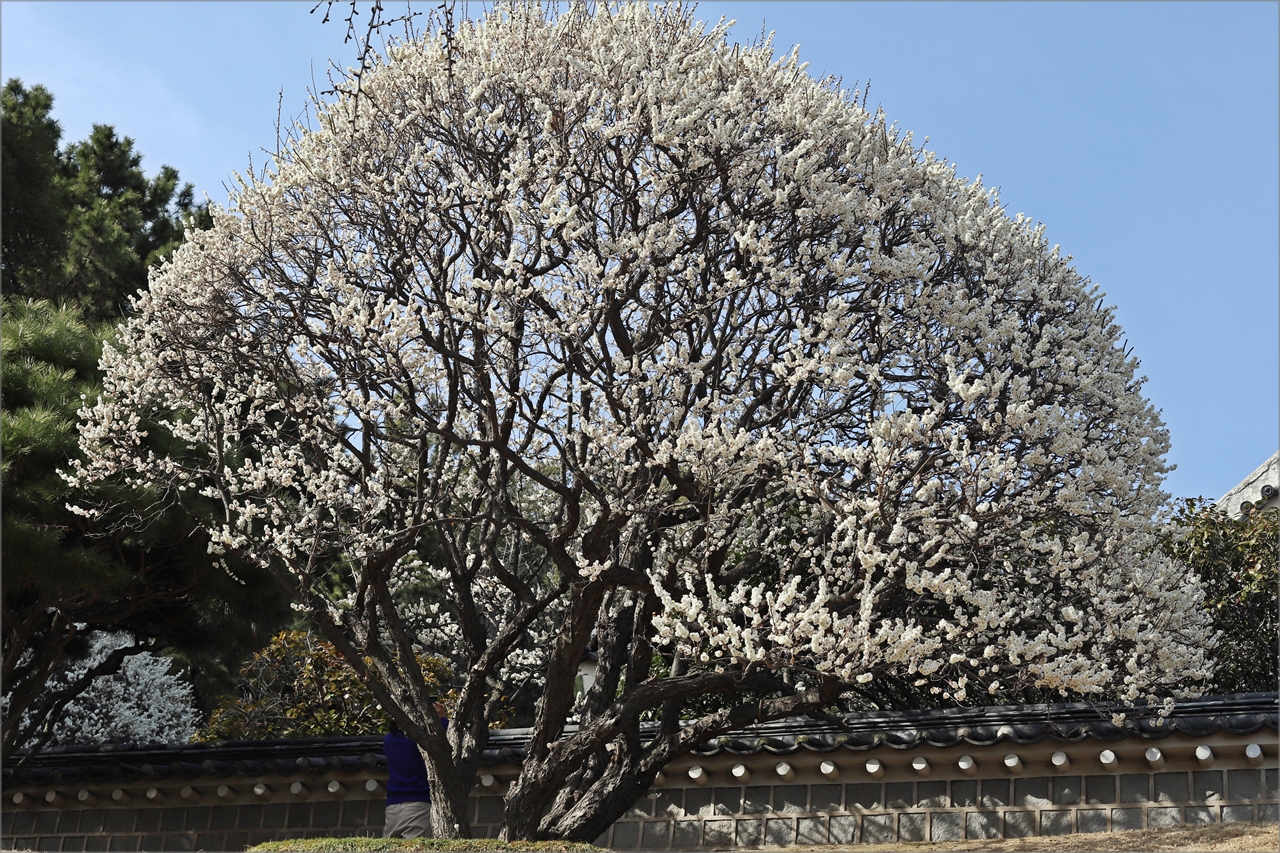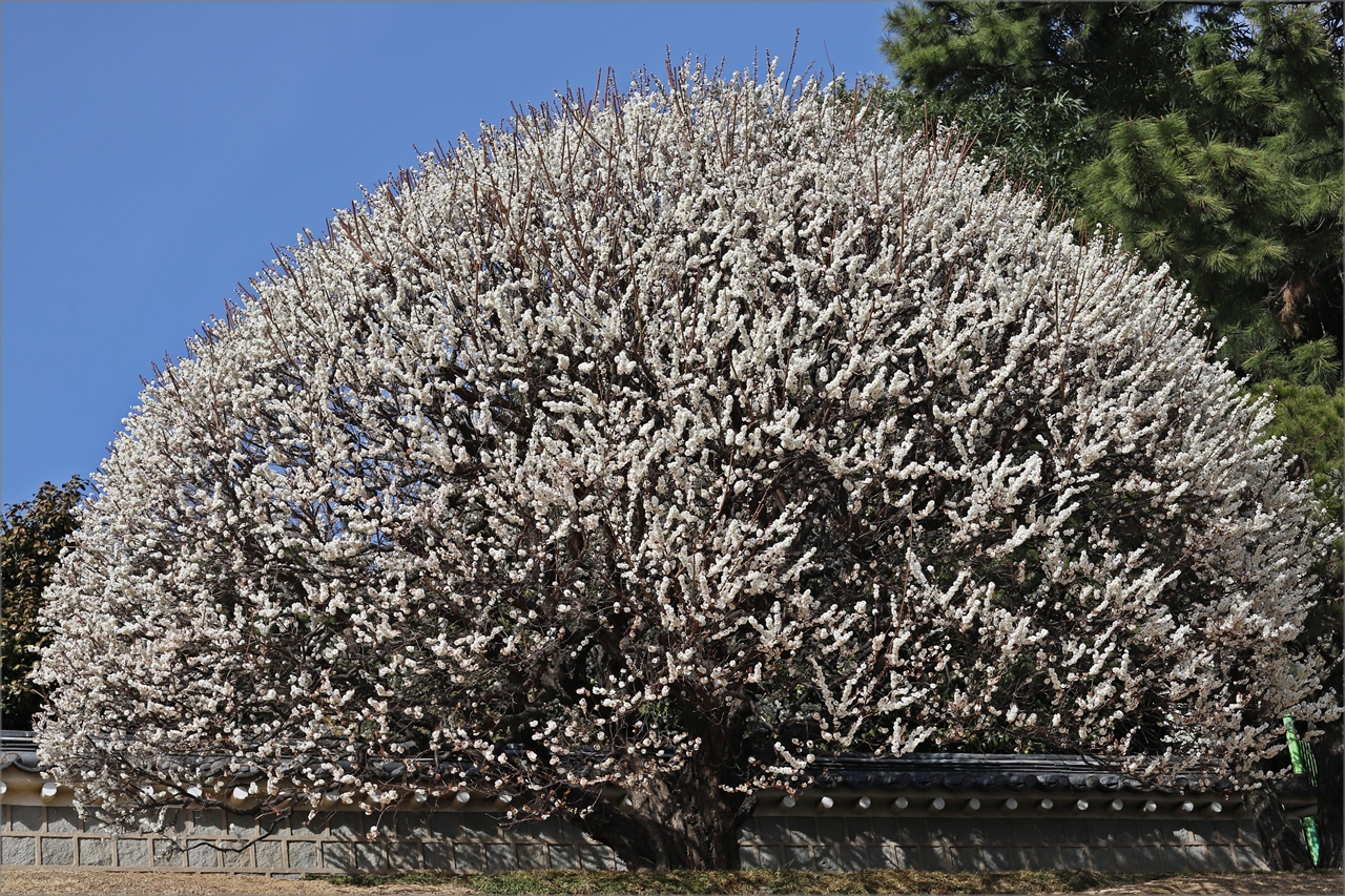 충렬사 충렬문 양쪽 언덕에 모양 좋은 만개한 매화나무