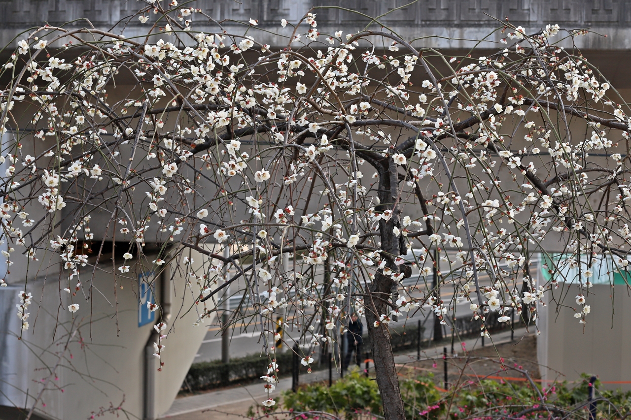 안락교차로 화단에 활짝 핀 청매화