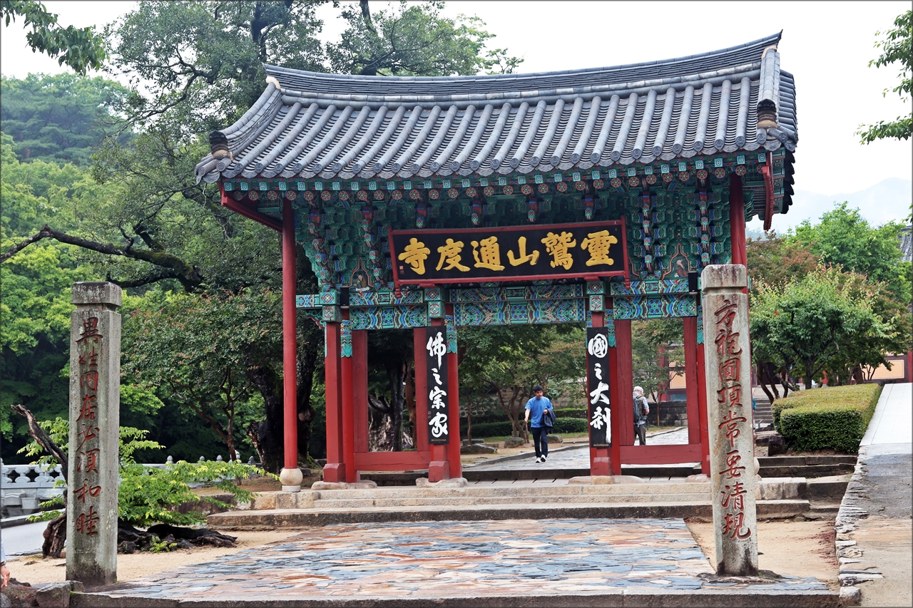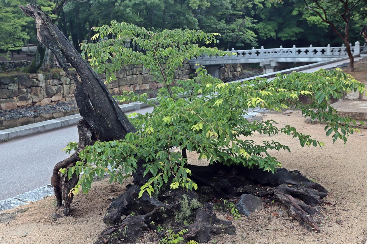 통도사 출입문인 일주문과 죽은 고목에서 새 줄기가 나온 포구나무