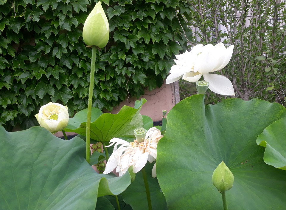 옥상정원의 연꽃재배 연못에 순수한 모양새의