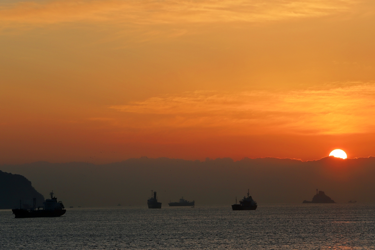 부산 남항 외항의 외항선 묘박지의 해뜨기 전 여명