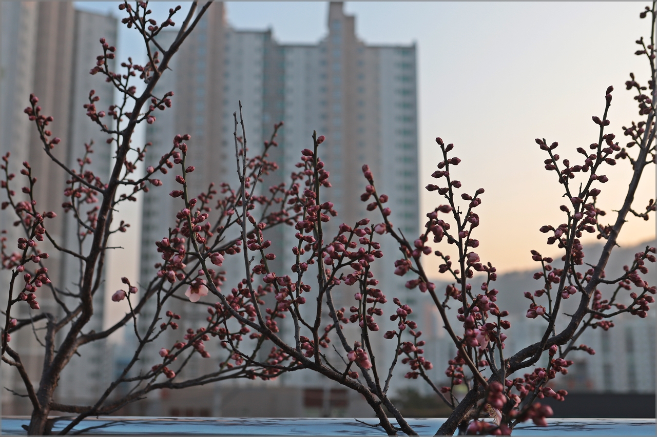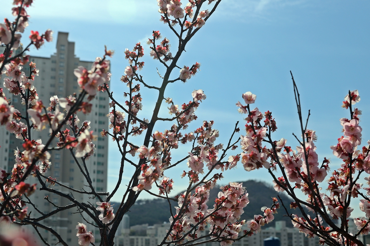 옥상 정원에 핀 향기로운 봄의 전령인 매화꽃