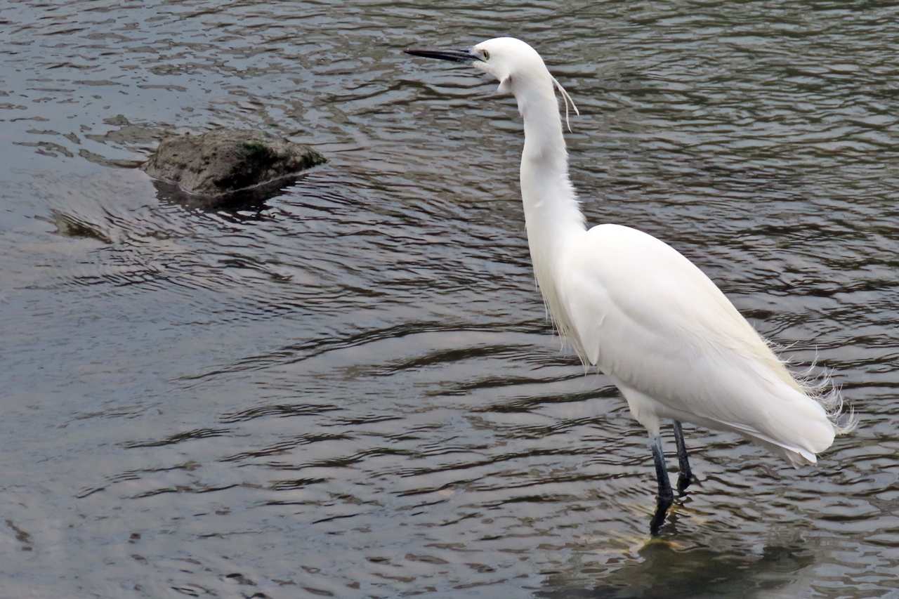 부리와 발이 검고 온몸이 백색인 철새에서 텃새로 변한 중대백로가 먹이사냥 중이다