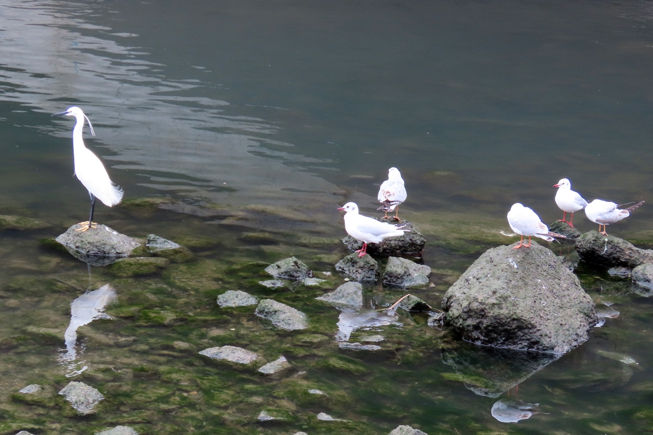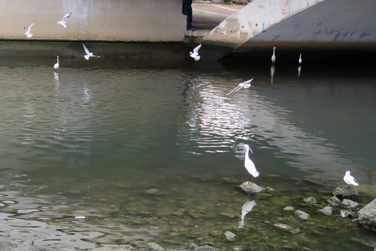 연산교 교각 아래에 왜가리, 중대백로, 갈매기들이 모여있다.