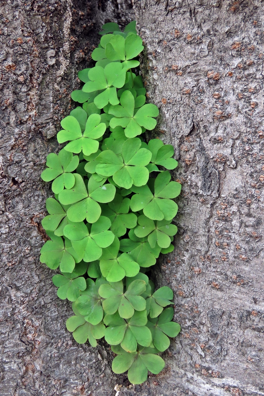 벚나무 가지 벌어진 틈새의 크로바가 겨울 추위를 견뎌내다.