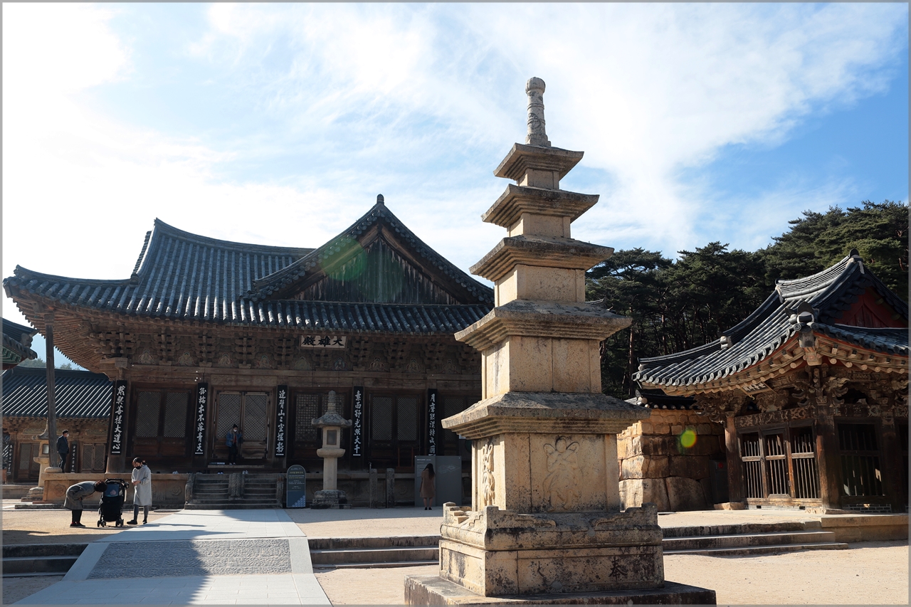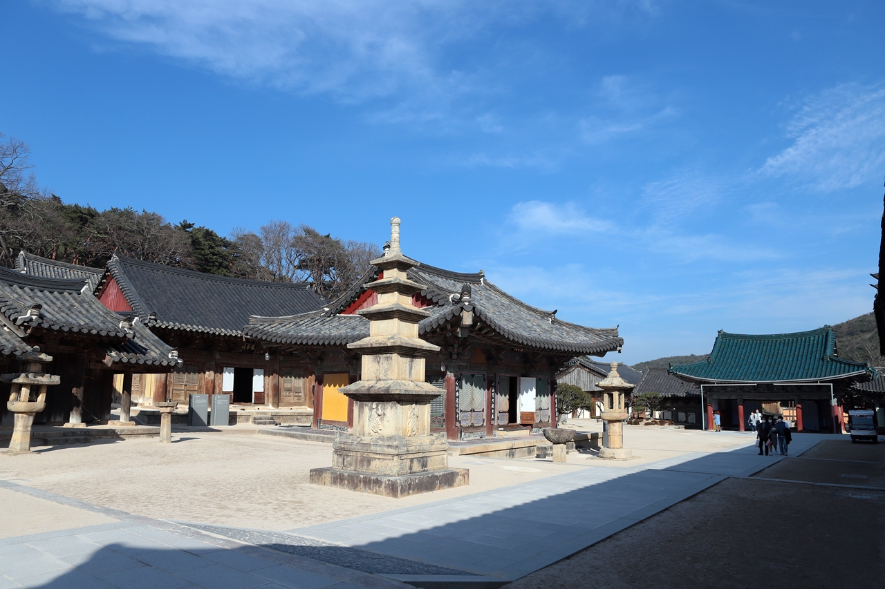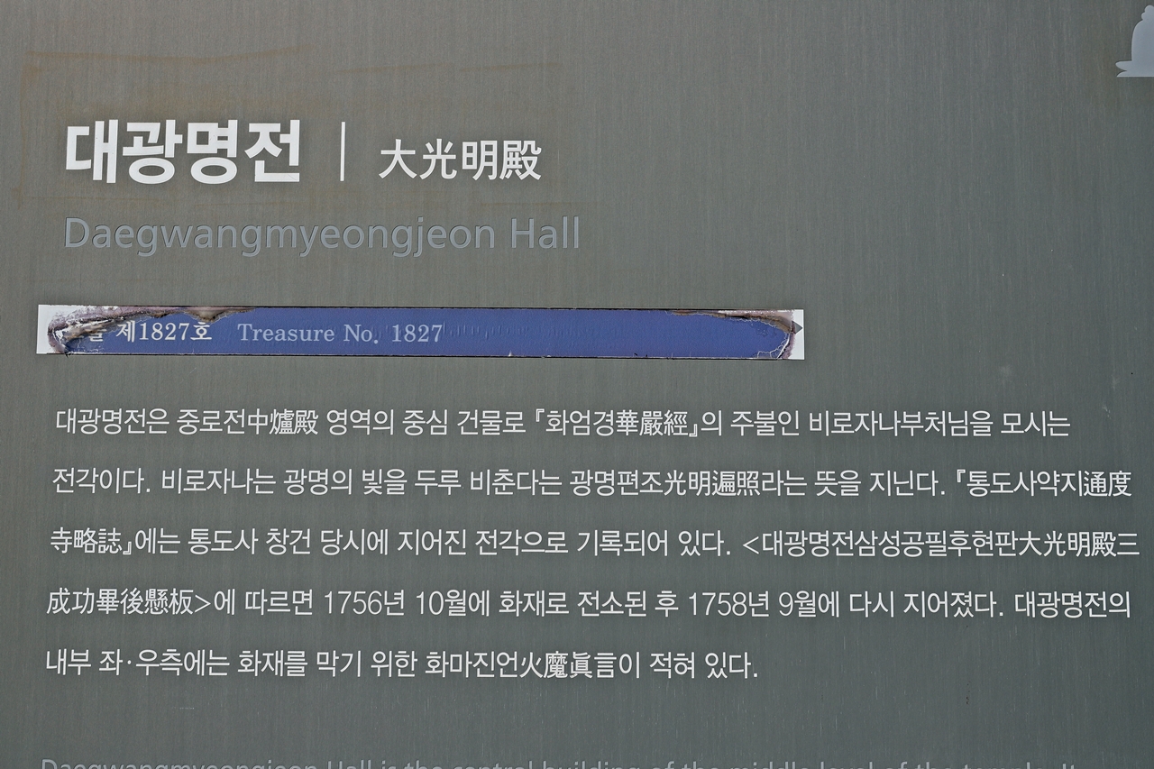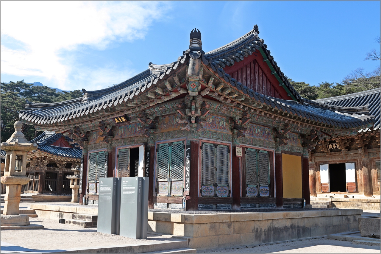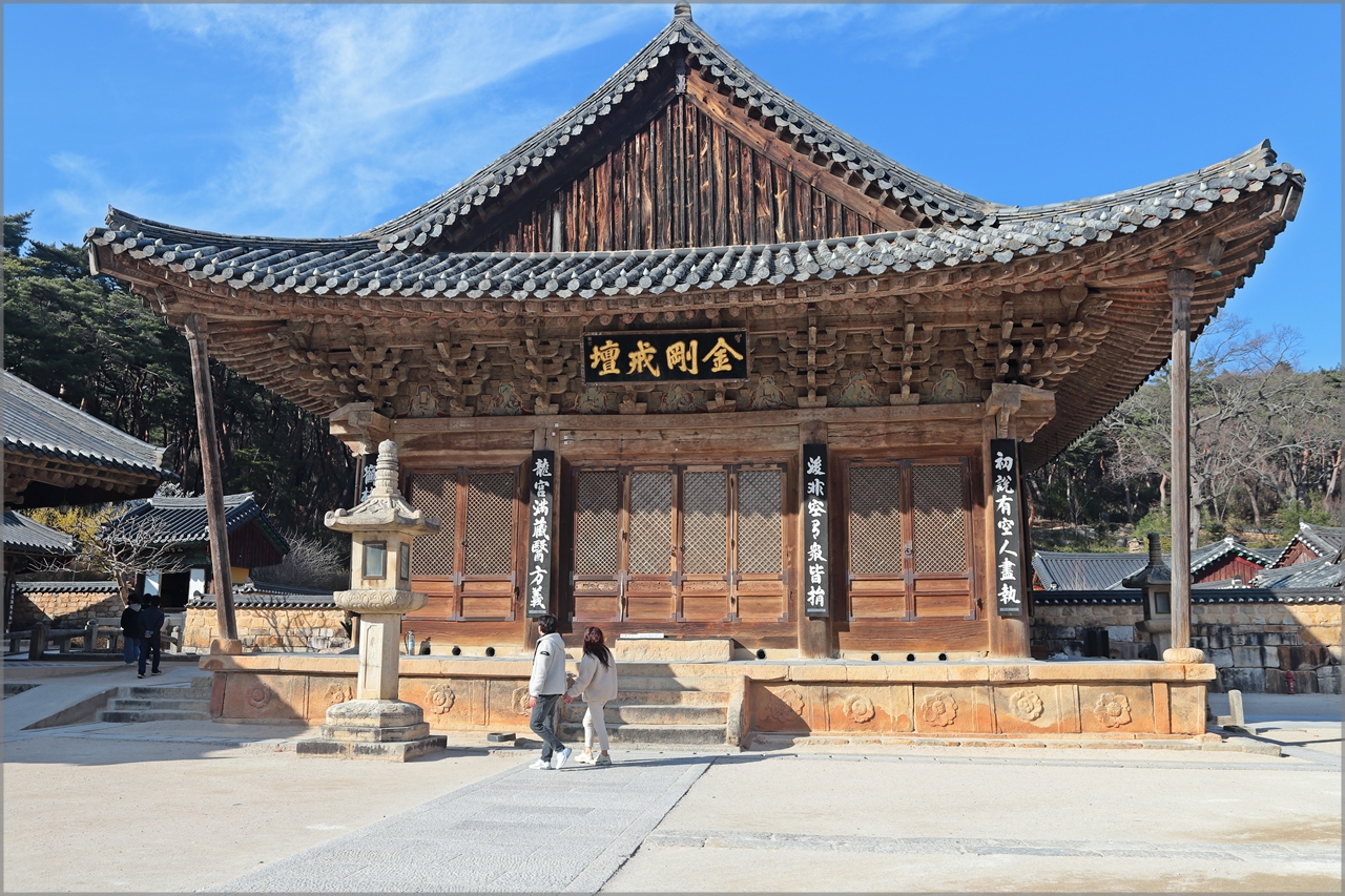 --남쪽은 금강계단, 동쪽은 대웅전 서쪽은대방광전, 북쪽에는 적멸보궁이라는 편액이걸려있다.