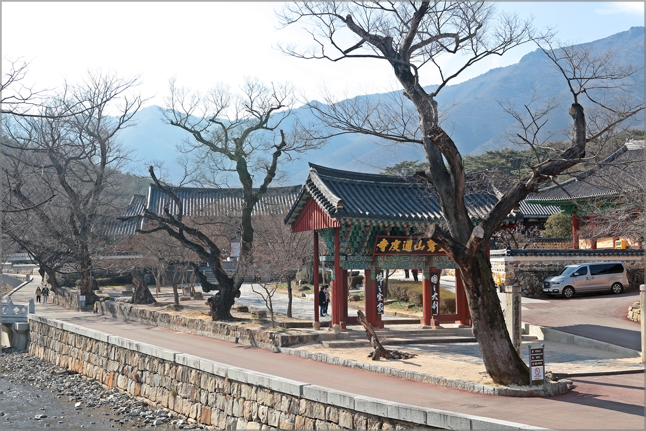 둥근 돌다리인 삼성반월교에서 본 통도사 일주문 부근 풍경