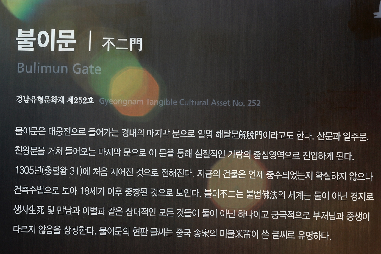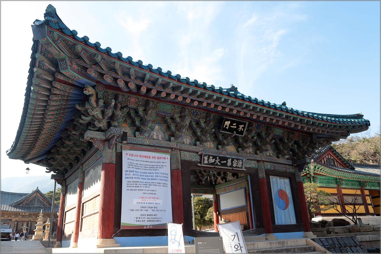 통도사 일주문 --기둥에 불교 종가, 국내 대찰 글귀가 위상을 말한다.