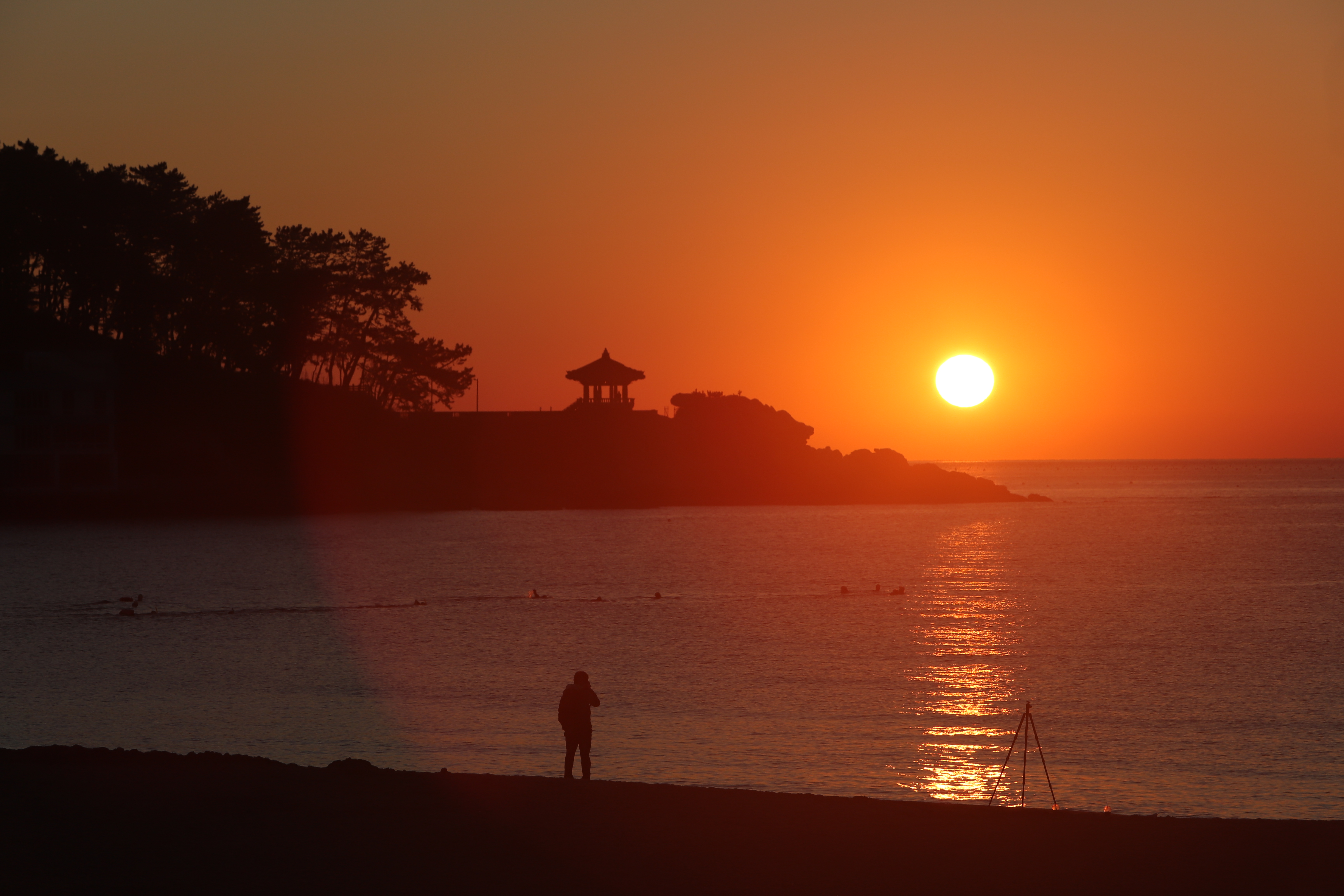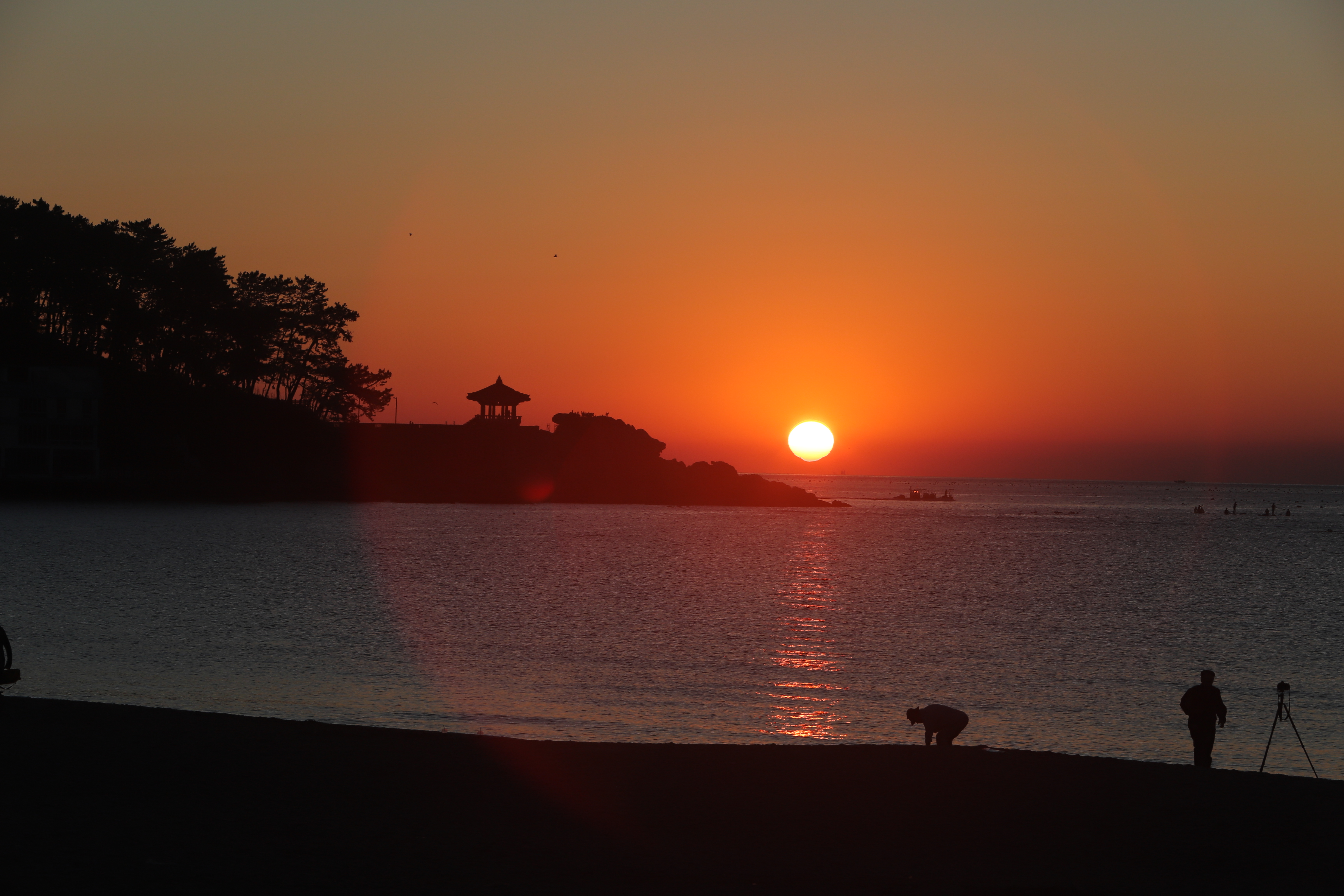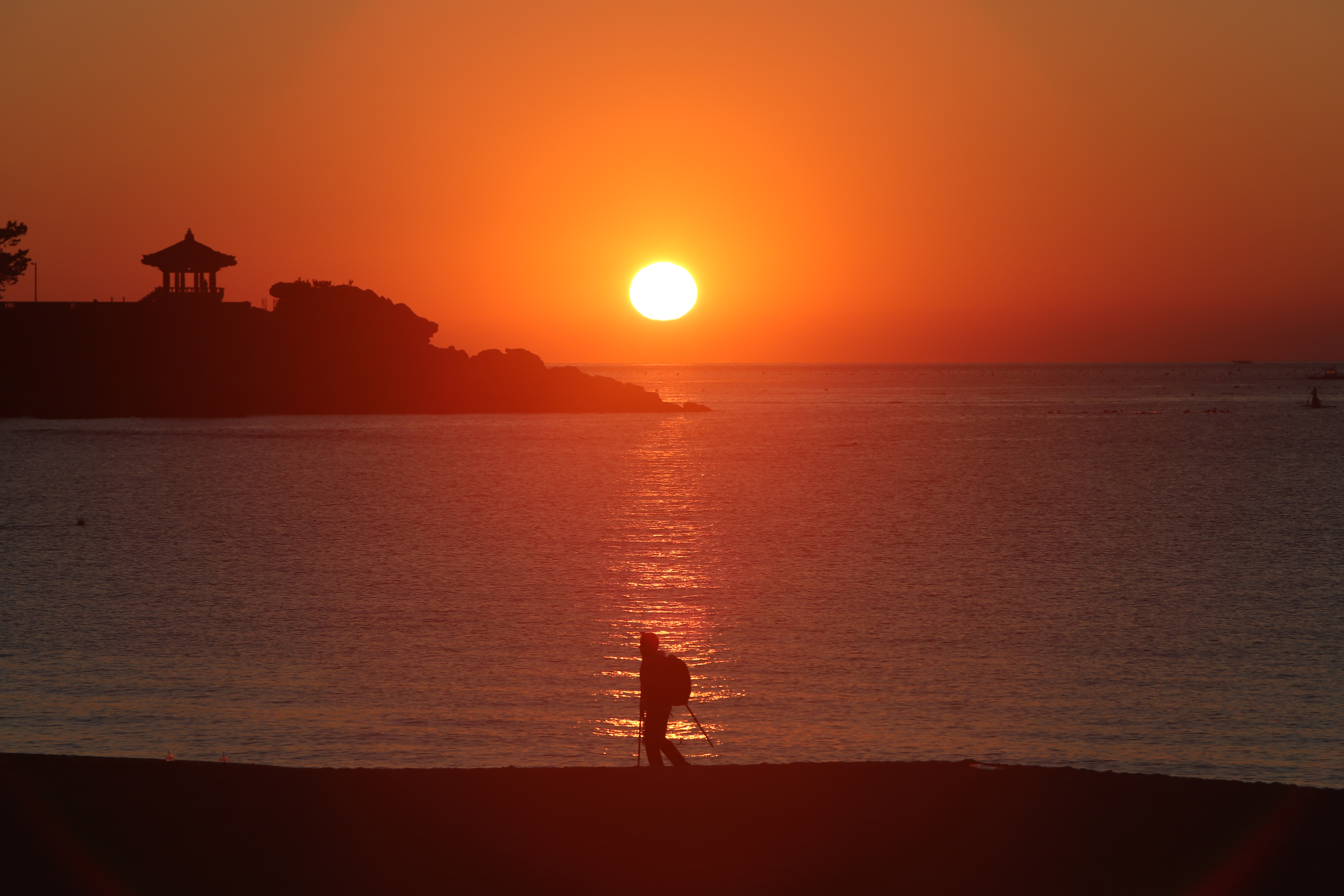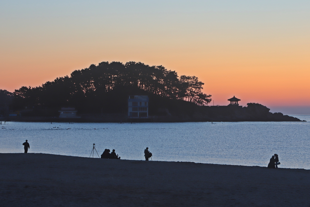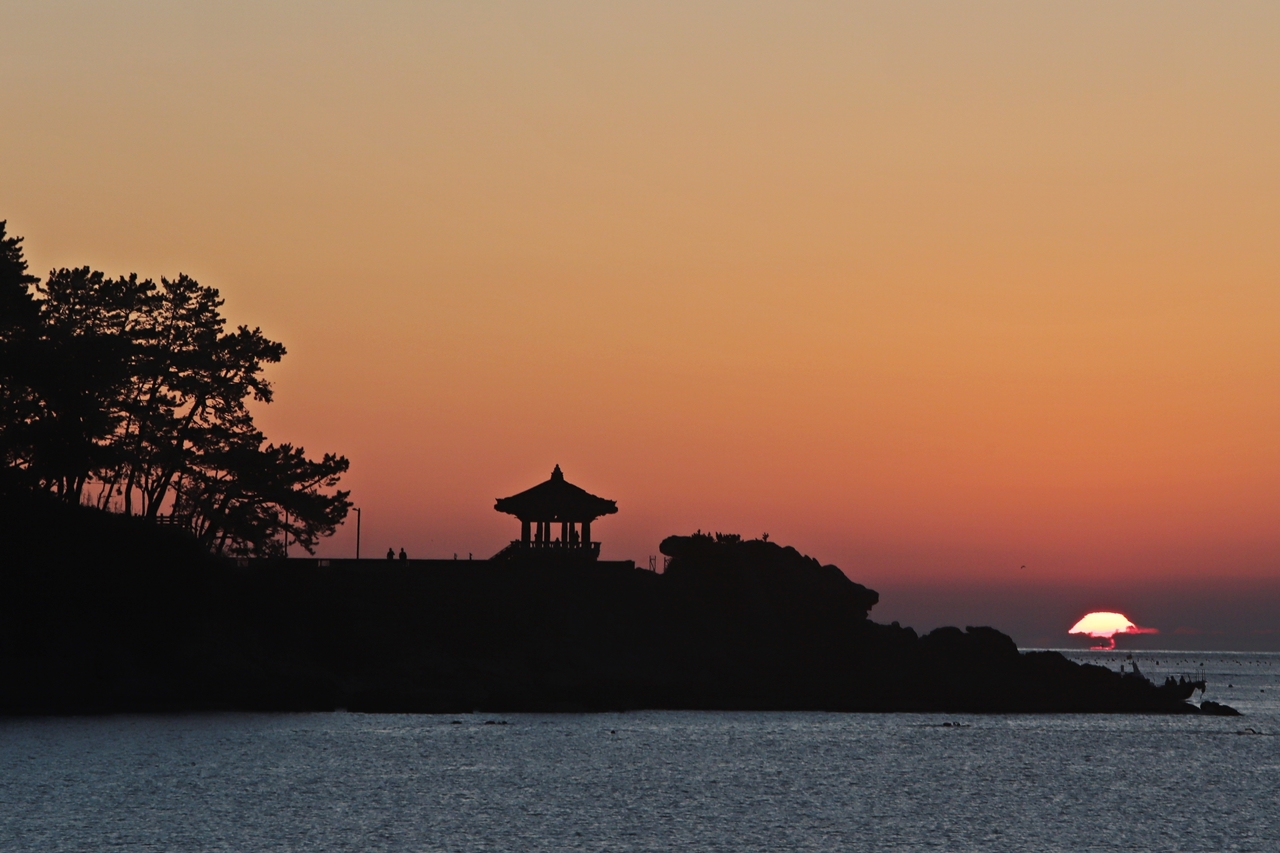 송정해수욕장에서 동쪽 수평선에 낀 구름 사이에서 떠오르는