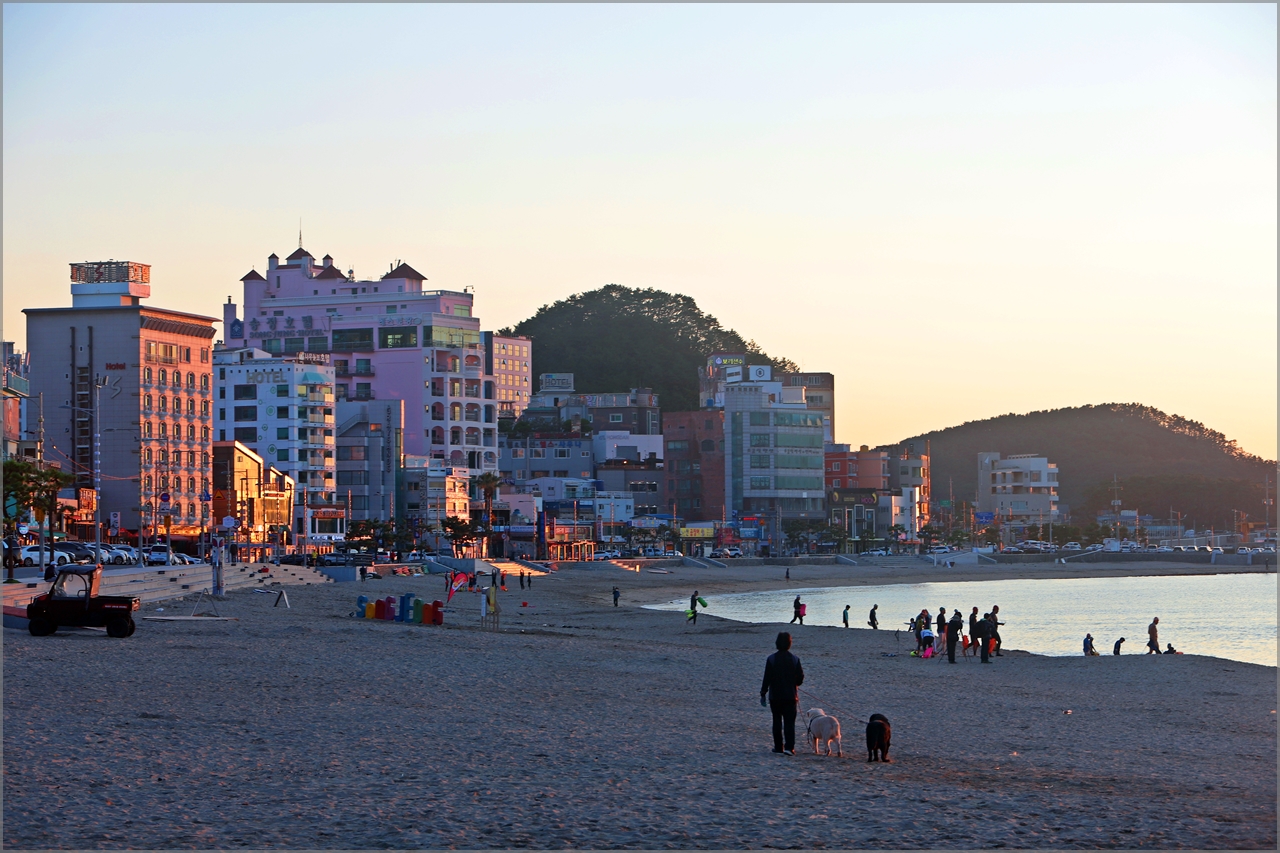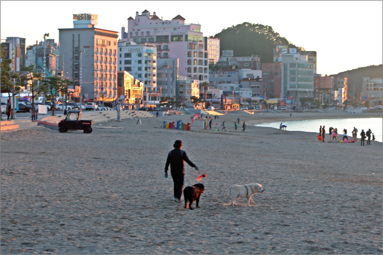 아침 햇살을 받은 송정해변의 숙박시설과 아침운동을 나온 시민들.